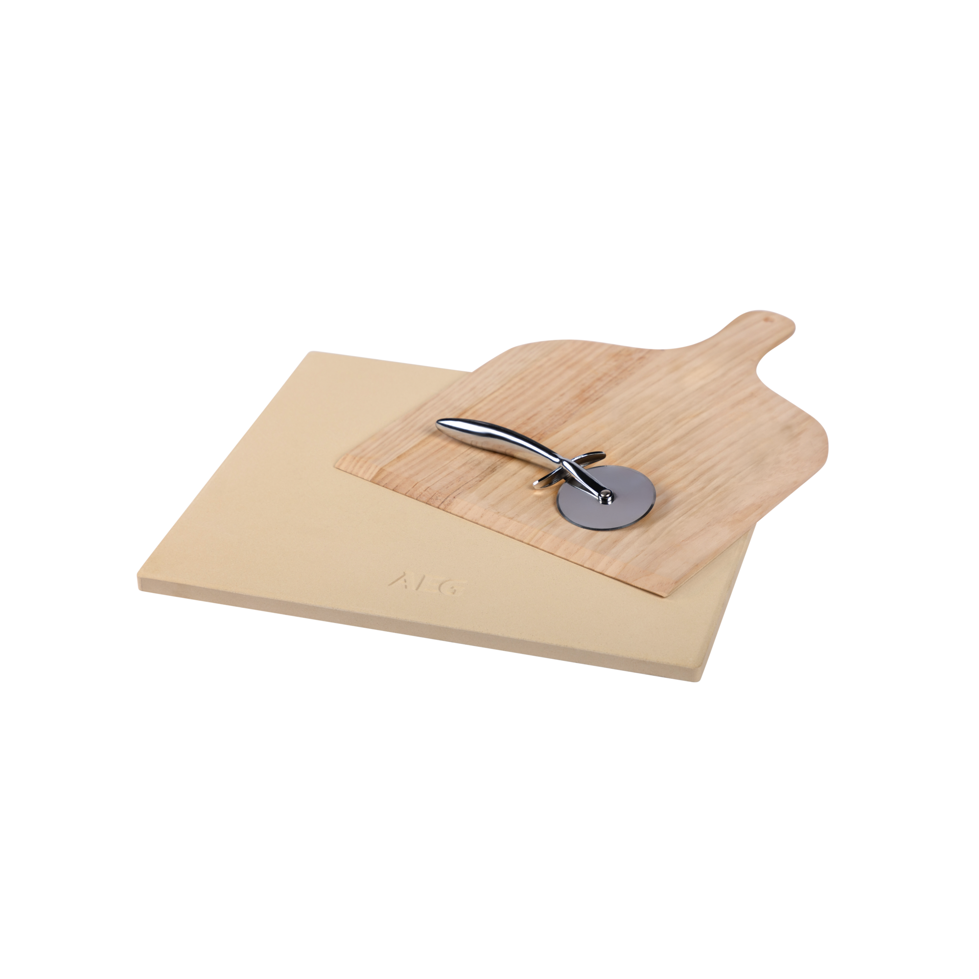 Backen. Aufschneiden. Servieren. Für jeden Schritt bestens ausgerüstet mit dem 3-teiligen Pizza-Set bestehend aus einem Kochstein, Holzbrett mit Griff und einem Schneidemesser.