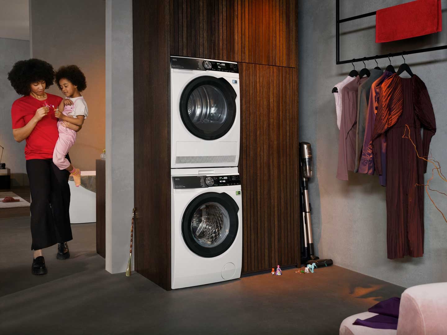 Werden die Geräte* durch die AEG App miteinander verbunden, kannst du deine Wäsche durch aufeinander abgestimmte Pflegeprogramme in unter 3 Stunden waschen und trocknen.