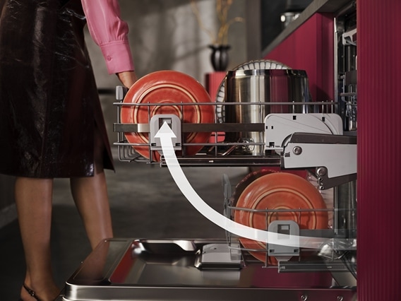 Die speziell entwickelten ComfortLift®-Scharniere heben den voll beladenen Unterkorb sanft auf die Höhe des Oberkorbs.