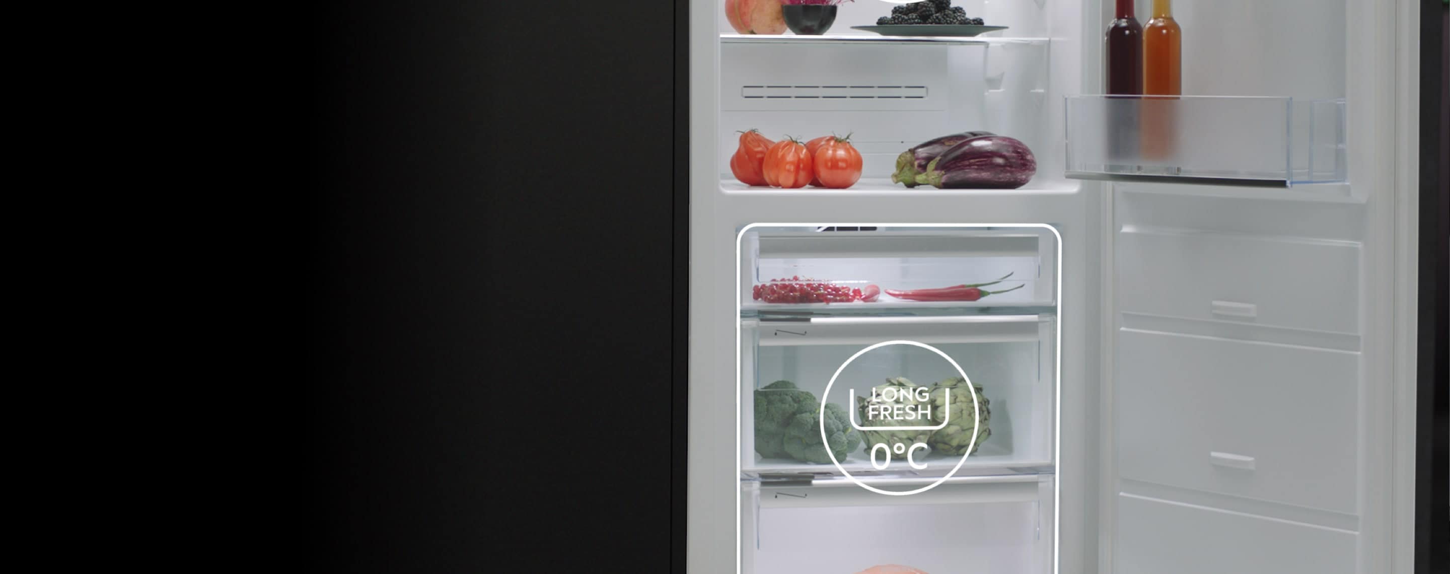 Das LongFresh 0 °C Fach bietet die ultimative Umgebung für den Schutz von Lebensmitteln. Der Bereich, der kälter als der Kühlschrank ist, wird auf 0 °C gehalten und ist die richtige Zone für Fisch, Fleisch oder feinere Erzeugnisse. Die integrierte Feuchtigkeitsregelung verhindert das Austrocknen. Für sorgfältig ausgewählte Produkte, die ihr volles Aroma behalten.