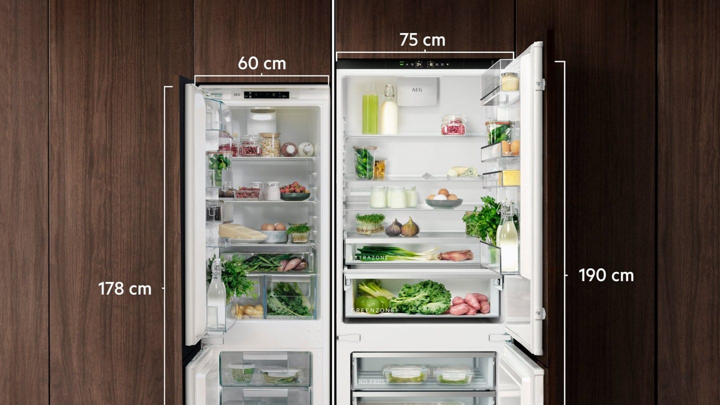 Unsere neue Nischengröße reicht jedoch über den Standard hinaus. Zusätzlich zur Standard-Größe von 60 cm Breite und 178 cm Höhe, bietet der MaxiSpace Kühl- und Gefrierschrank mit 75 cm Breite und 190 cm Höhe eine 45 % höhere Kapazität als eine Standard Kühl-Gefrierkombination.