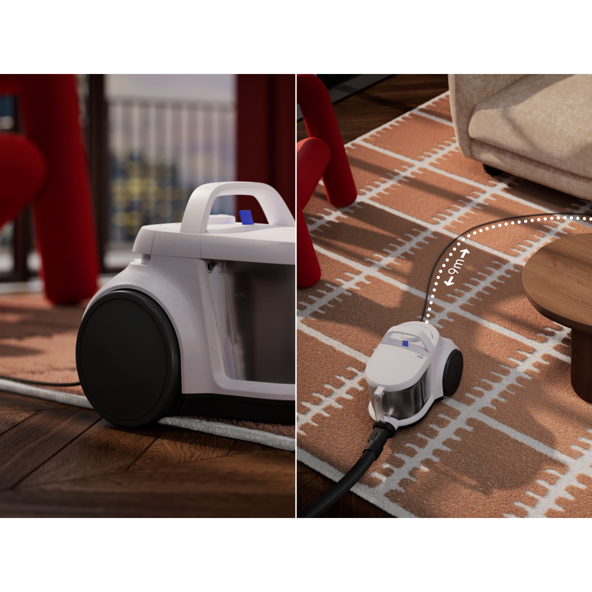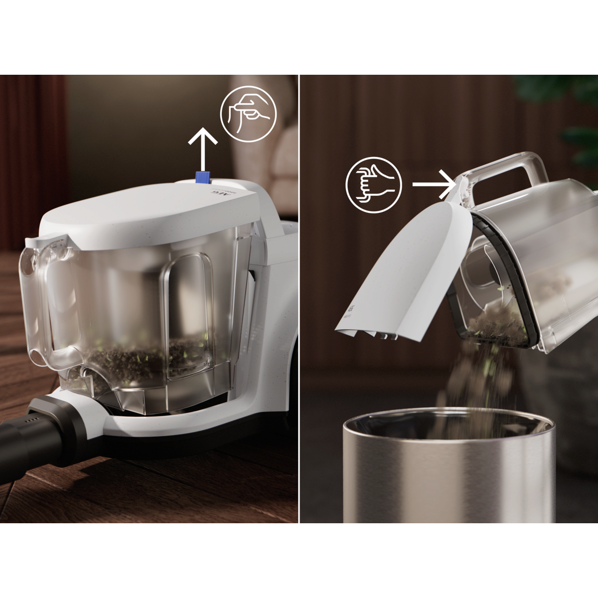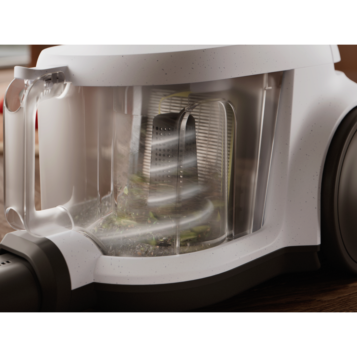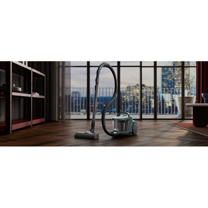 Der 2-Liter-Staubbehälter und eine fortschrittliche Zyklontechnologie sorgen für effiziente Reinigung und weniger Entleerungen. Sein kompaktes Design ermöglicht ein einfaches Verstauen. Die HEPA-Filterung und recycelte Materialien sorgen für sauberere Luft und ein hohes Maß an Nachhaltigkeit.