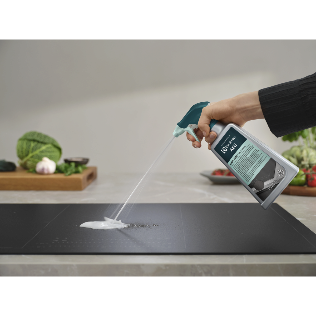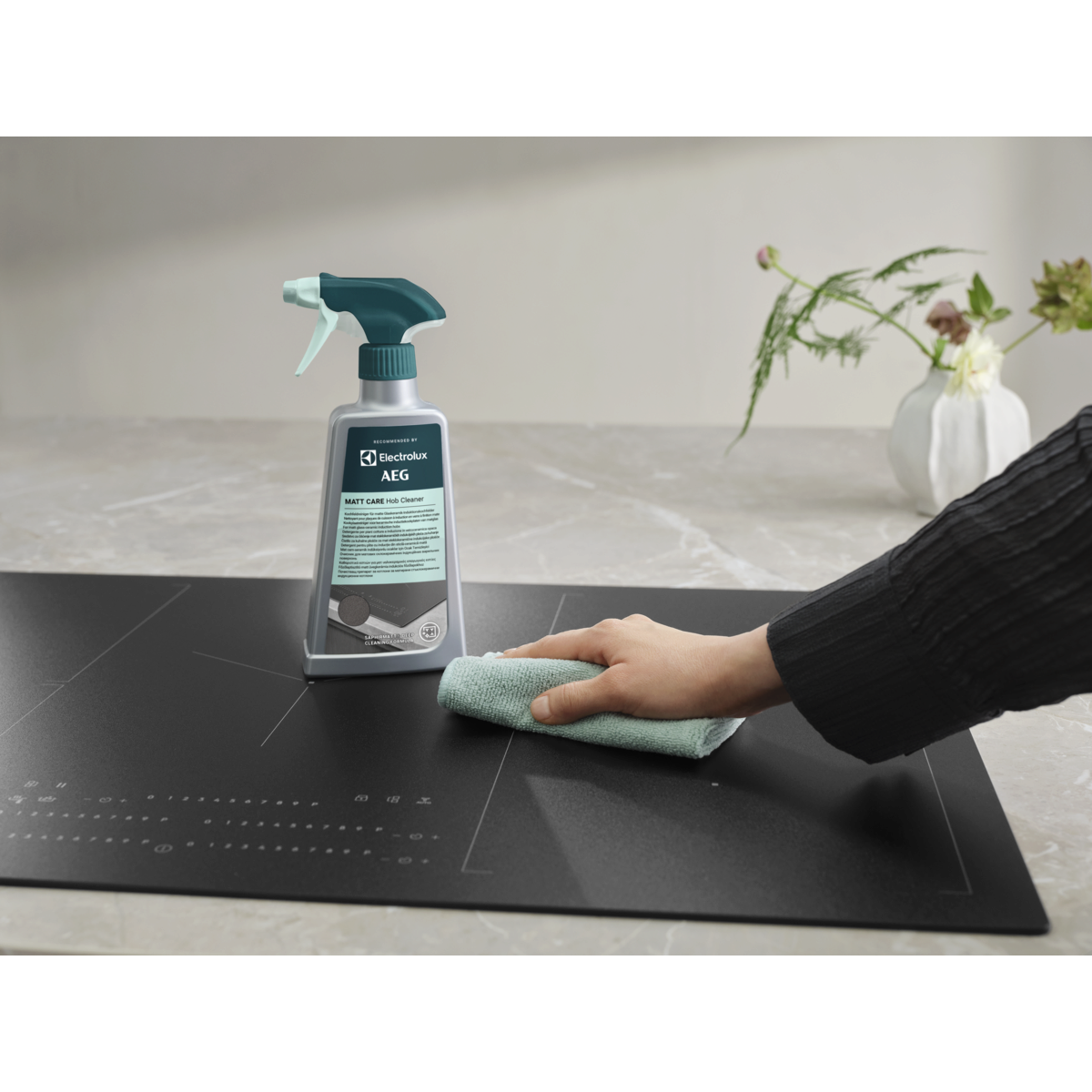 Der MattCare Kochfeldreiniger ist die Speziallösung für die Tiefenreinigung matter Glaskeramik-Induktionskochfelder – inklusive SaphirMatt® und SaphirMatt® SE*. Er entfernt hartnäckiges Fett und eingebrannte Rückstände – für ein dauerhaft sauberes Kochfeld.