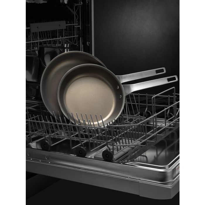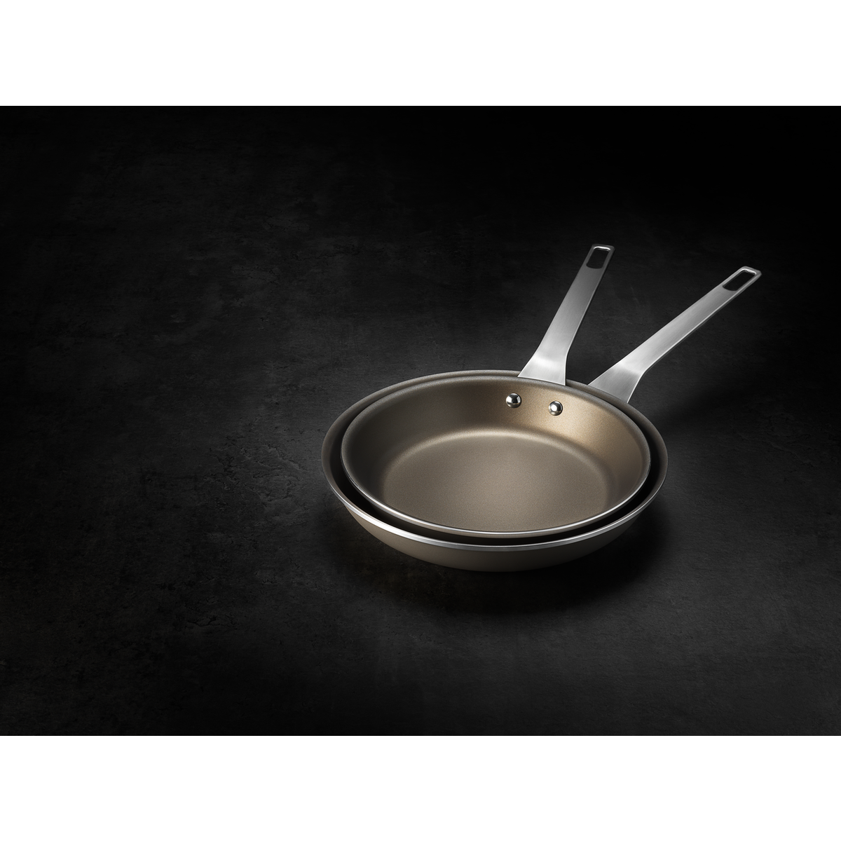 Kombinieren Sie Funktionalität und Leistung im Alltag. Dieses champagnerfarbene Set aus aluminiumbeschichteten Pfannen eignet sich ideal zum fettarmen oder fettfreien Frittieren, Anbraten und Bräunen im täglichen Gebrauch. Alle Pfannen verfügen über eine Antihaftbeschichtung und sorgen für eine schnelle und gleichmäßige Erhitzung der Speisen, und eine sanfte Feuchtereduktion in der Mitte. Einfach anzuheben dank der ergonomischen Griffe. Die Antihaftbeschichtung ist durch DUPONT zertifiziert. Ofenfest bis zu 250 °C. Abmessungen: Ø 26 cm und Ø 30 cm