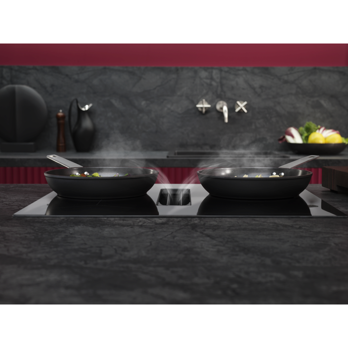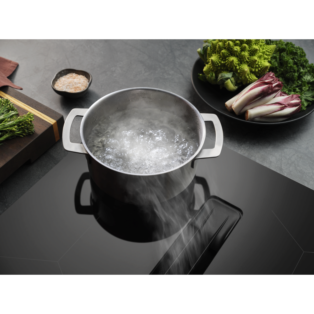 Weniger Warten, weniger Kochgerüche. Die AEG Fast & Powerful Induktionskochfelder der Serie 5000 vereinen schnelles und effizientes Induktionskochen mit dem Komfort eines integrierten Dunstabzugs.