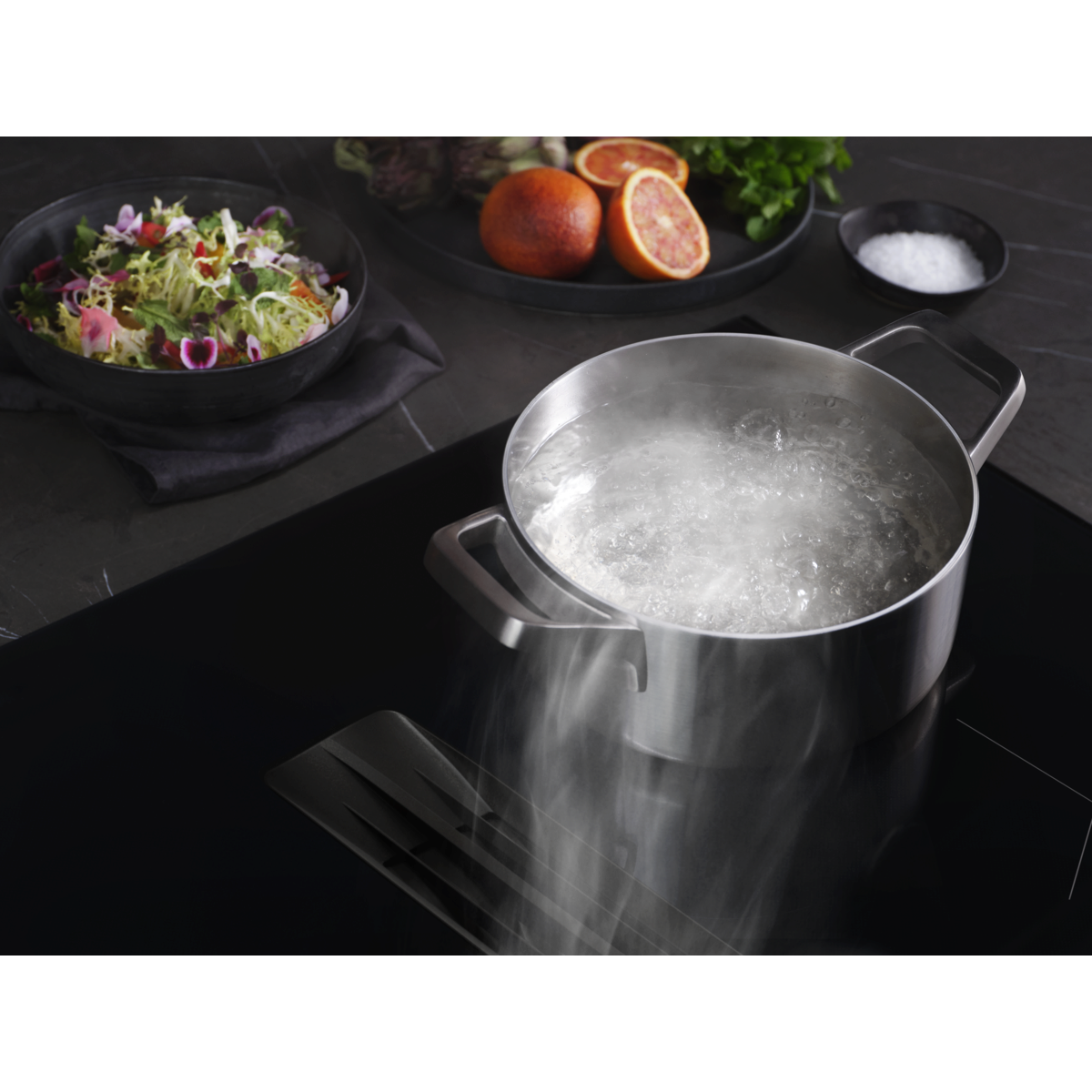 Weniger Warten, weniger Kochgerüche. Die AEG Fast & Powerful Induktionskochfelder der Serie 5000 vereinen schnelles und effizientes Induktionskochen mit dem Komfort eines integrierten Dunstabzugs.
