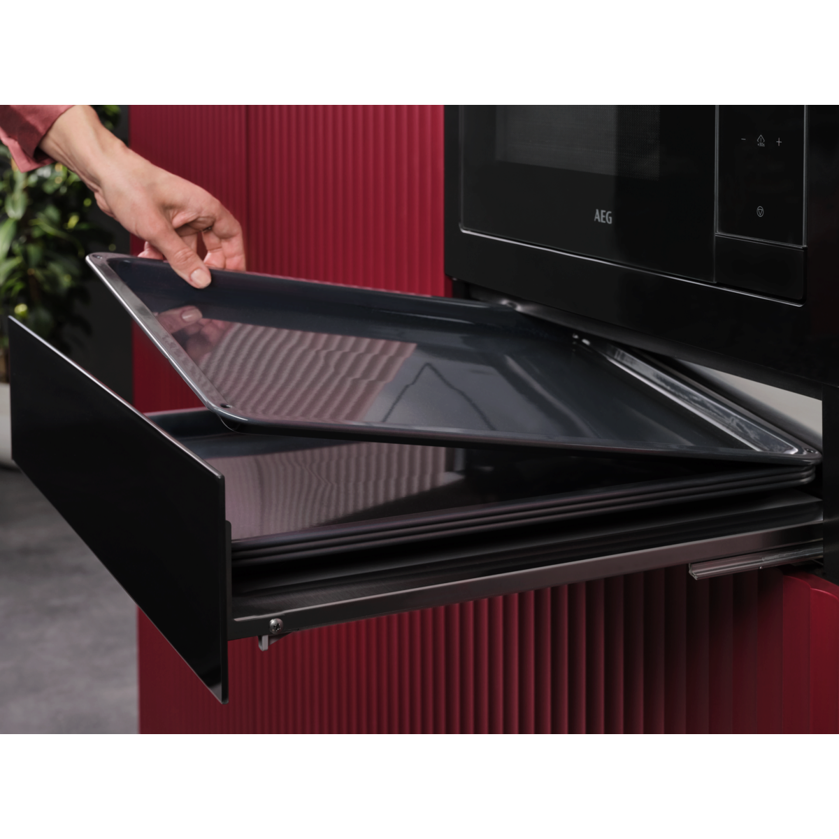 Bewahre Backbleche, Teller und Küchenutensilien griffbereit, aber ordentlich verstaut, in der Aufbewahrungsschublade auf, die sich harmonisch in das Design deiner Einbauküche einfügt.