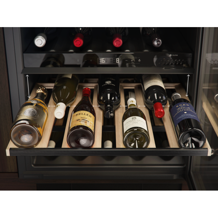 Das perfektionierte Regalsystem ermöglicht dir das Lagern deiner gesamten Sammlung, unabhängig der Flaschengröße. Die ausziehbaren Premium-Holzablagen bieten den idealen Abstand für alle 750-ml-Flaschentypen – sogar für deinen Lieblings-Champagner, ohne das Etikett zu zerkratzen.