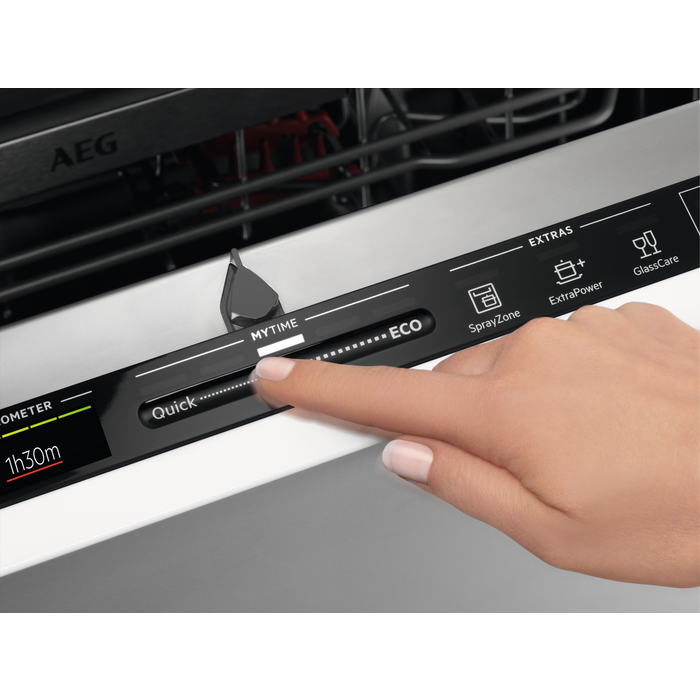 Per Fingertipp bestimmst du, wie lange der Spülgang dauern soll. Mittels des Ecometers kannst du ablesen, wie ökologisch das gewählte Reinigungsprogramm ist. Wähle in fünf Stufen zwischen eher langsameren, aber energieeffizienteren oder schnelleren Programmen mit mehr Verbrauch.