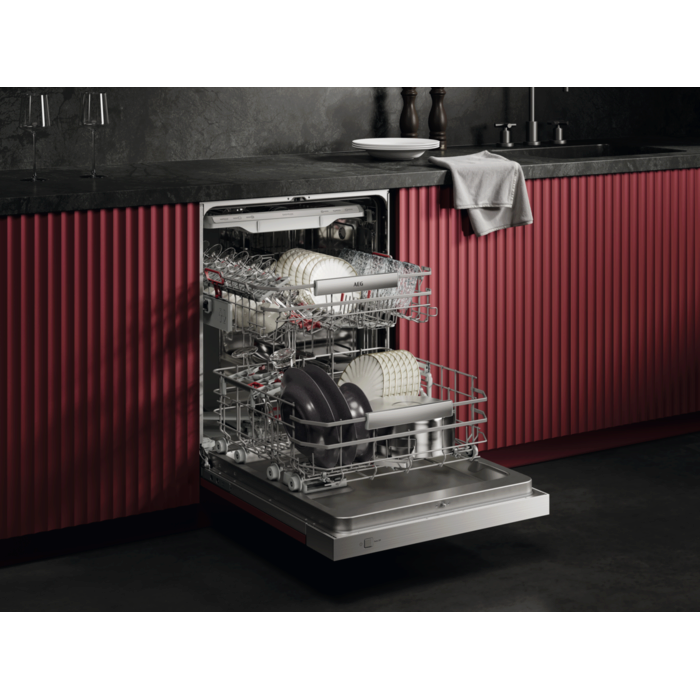 AEG Geschirrspüler der Serie 8000 sorgen für eine kraftvolle Reinigung, selbst bei hartnäckigen Speiserückständen wie Eingebranntem. Die vielseitigen, leichtläufigen Körbe verfügen über klappbare Bereiche und spezielle Glashalterungen. Das hocheffiziente Wassersystem verbraucht nur 8,4 Liter.