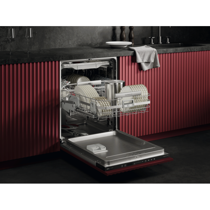 AEG Geschirrspüler der Serie 9000 XXL verfügen über 5 cm mehr Platz, passen unter eine 90 cm hohe Arbeitsplatte, und über multifunktionale Körbe sowie Halterungen für Gläser und Backbleche. Das Wassersystem entfernt hartnäckige Speiserückstände bei einem Wasserverbrauch von nur 8.4 Litern.