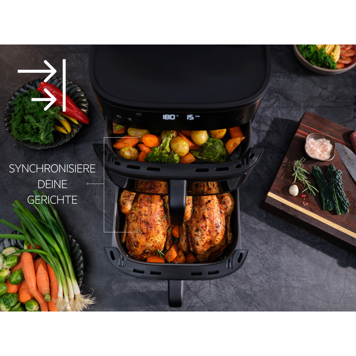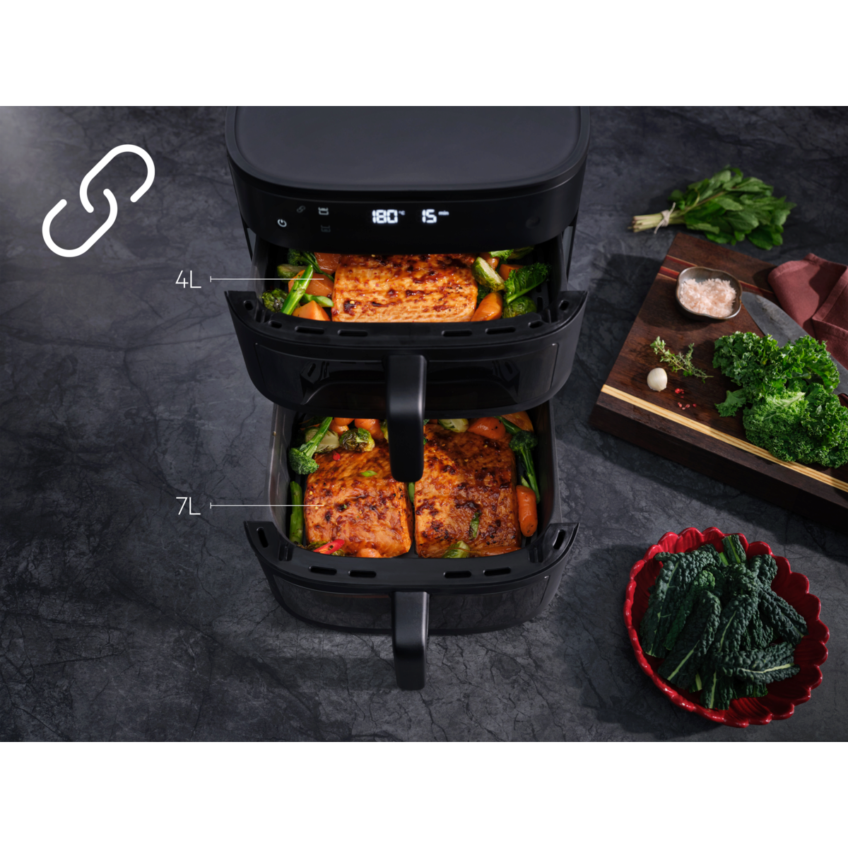 Kapazität ohne Kompromisse. Für die ganze Familie schnell eine gesunde Mahlzeit auf den Tisch zu bringen, war noch nie so einfach. Das Doppelkorb-System ermöglicht Familienportionen ohne Kompromisse bei Geschmack oder Textur.
