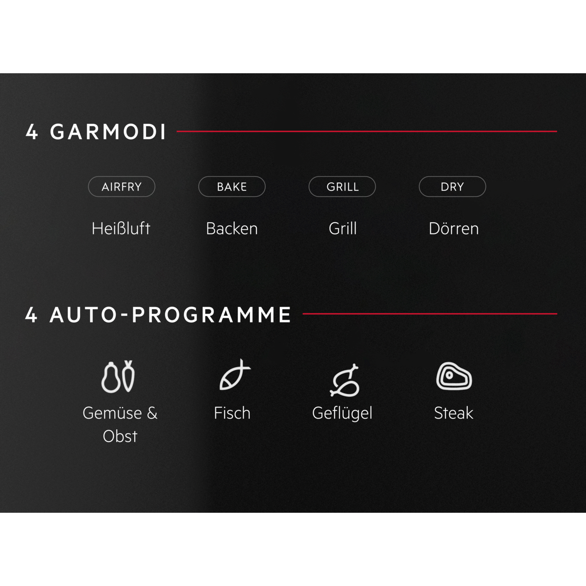 **Basierend auf internen Tests, bei denen die Innentemperatur von Würstchen verglichen wurde, die im Modell EAF5B in einer Schicht gegenüber zwei Schichten gegart wurden. Die tatsächlichen Ergebnisse können je nach Art, Menge und Garmethode der Lebensmittel variieren.