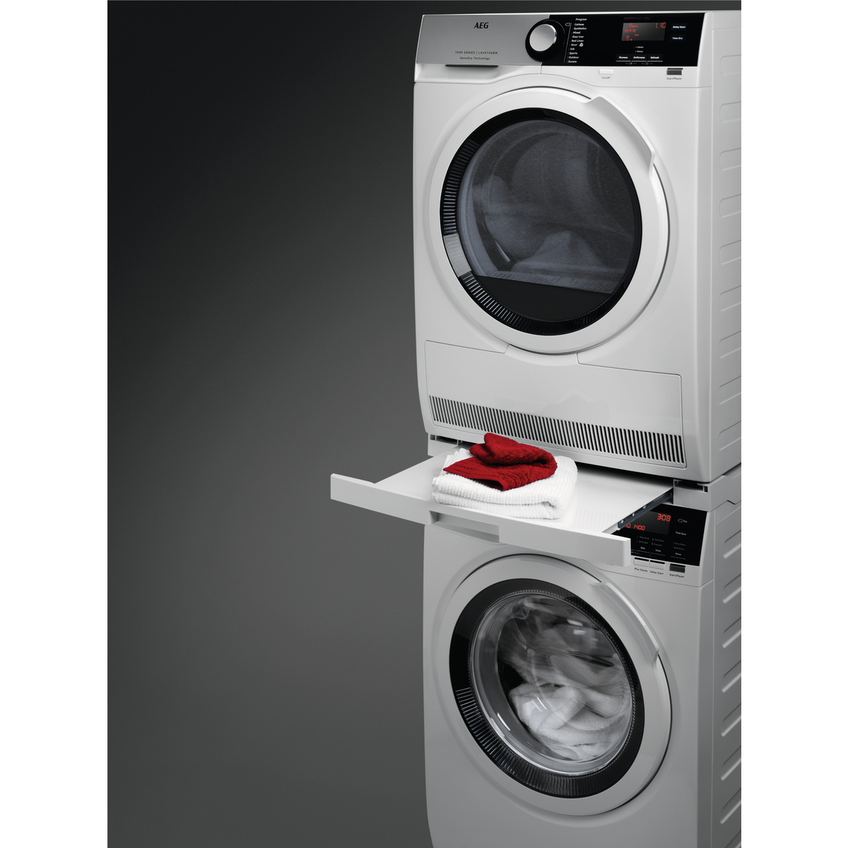 Platziere mit dem AEG Verbindungssatz für die Wasch-Trockensäule deinen Trockner platzsparend und sicher über deiner Waschmaschine. Die praktische, ausziehbare Arbeitsfläche erleichtert dir die Handhabung beim Sortieren deiner Wäsche.