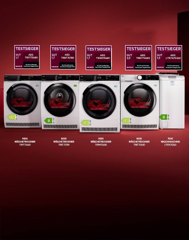 Der AEG 9000 AbsoluteCare® Trockner TR9M75680 wurde im aktuellen Wäschetrockner-Test der Stiftung Warentest (09/2025) mit der Gesamtnote 1,7 als Testsieger ausgezeichnet.