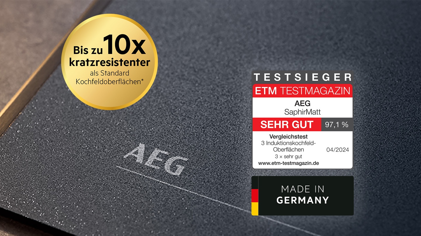 * Basierend auf Abriebtests eines externen Schweizer Labors gemäß internationalem Standard IEC 60068‑2‑70. Die Sichtbarkeit von Kratzern wurde intern im Vergleich zu Standard-Glaskeramikkochfeldern ohne spezielle Behandlung oder Beschichtung bewertet.
