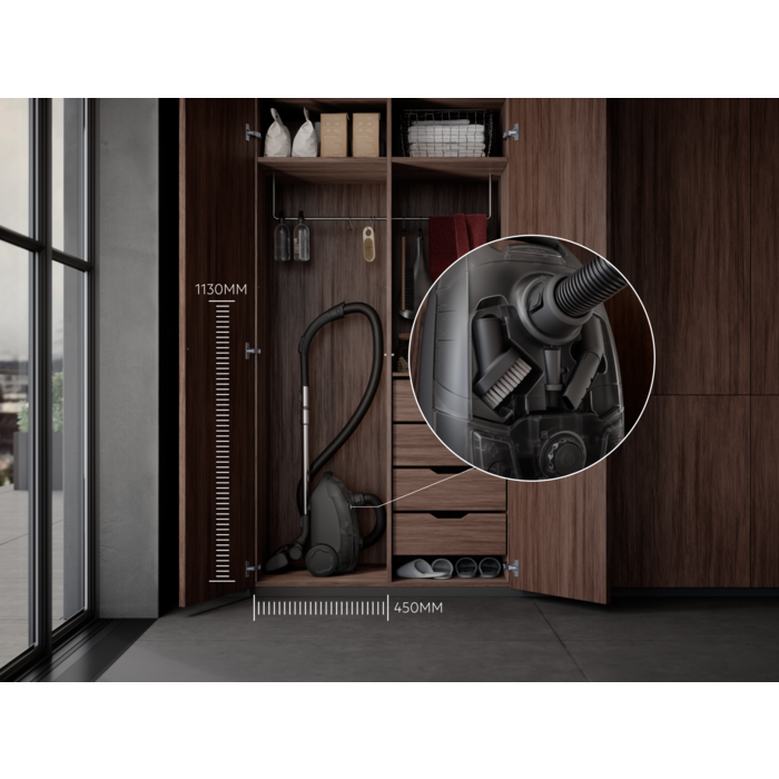 Der kompakte 5000 Staubsauger entfernt effizient Staub und Schmutz von allen Oberflächen. Mit der AllFloor Bodendüse kannst du problemlos von Hartböden auf Teppiche wechseln. Weiteres Zubehör ist dank integrierter Ablage jederzeit griffbereit.