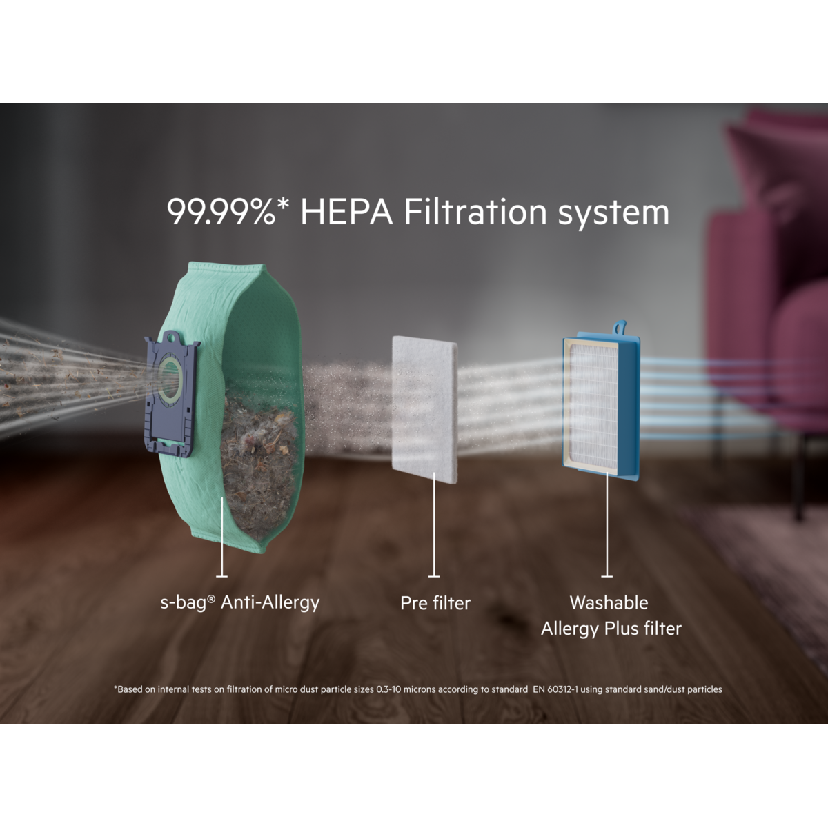 * Basierend auf internen Tests zur Filtration von Mikrostaubpartikeln der Größe 0,3–10 Mikrometer gemäß der Norm EN 60312-1 unter Verwendung von Standardsand/Staubpartikeln.
